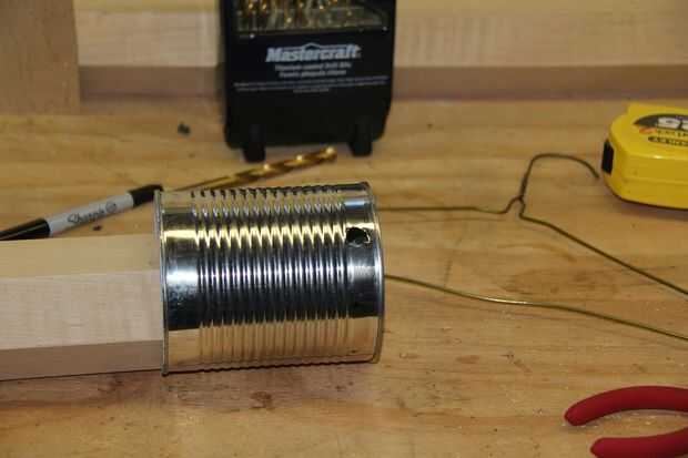 Taladre los orificios donde usted hizo su arranque en el paso anterior. Puedes ver en la foto que tenía madera dentro de la lata. Esto es porque el poder se dobla con el taladro por lo que hizo la perforación un poco más fácil, actuando como soporte. Usé el mismo orificio de tamaño de ambas latas pero puedes hacer uno más pequeño si quieres (no sé por qué le gustaría aunque). Sólo asegúrese de que los agujeros no demasiado pequeños o el aspecto de la ventilación no funcionará así.