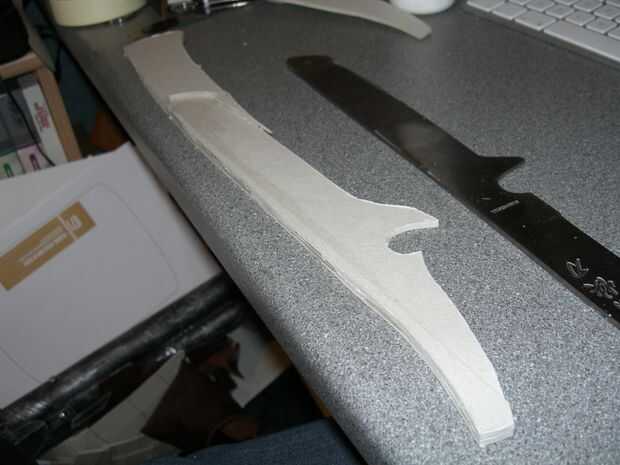 La primera etapa de la manija se realiza mediante tres secciones de la tarjeta, utilizando la plantilla de corte tres trozos exactamente iguales. Luego, utilizando la plantilla, o a colocar la espada. Corte una hendidura para el metal de la hoja. Para mí, el espesor de la lámina era igual a mi tarjeta.
