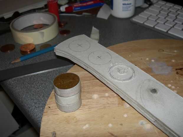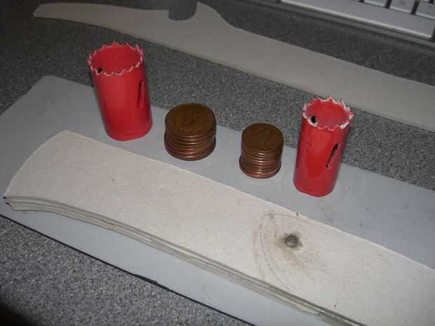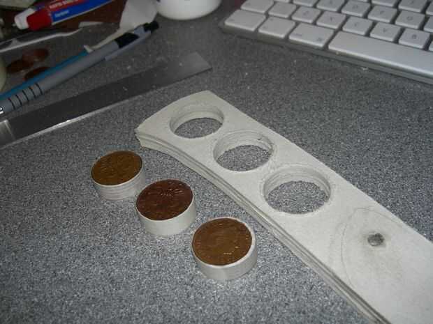 Mis cortadores de agujeros cavados y encontrarlos adecuados. Usé tres pilas de piezas de 2 peniques.