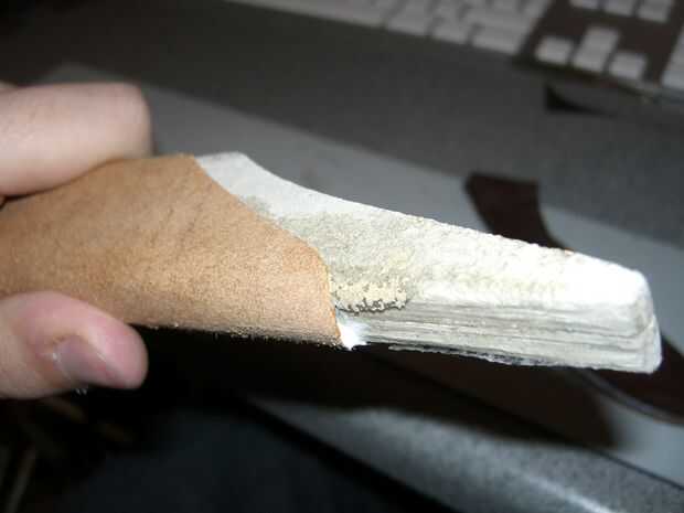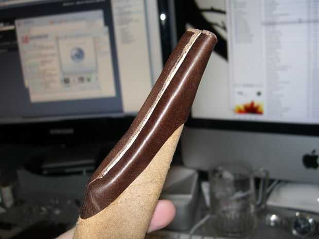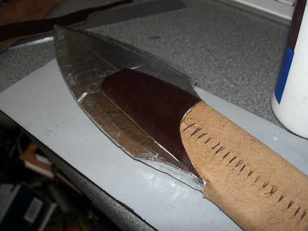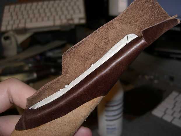 En los dos extremos que remató con un poco de la piel de la manija, el pegamento PVA actúa como el agua y da a la piel una ligera elasticidad, que permiten moldear en las formas.