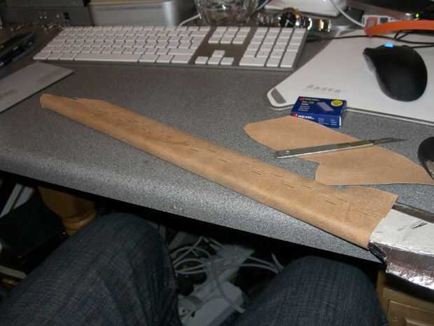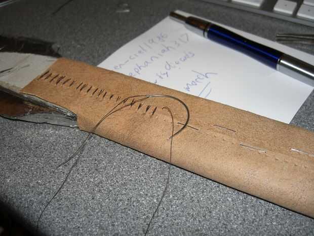 Cortar un rectángulo de áspero hacia fuera y estirado alrededor de la funda para comprobar el ajuste. Pegué este cuero en su lugar con pegamento PVA (embarcaciones), mientras que la cola estaba mojada usé una aguja curvada para la Unión de la puntada, un poco de tensión aquí ayuda el cuero ajuste y estiramiento alrededor de la vaina más fácil.