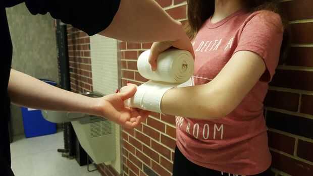 Después de determinar la eslinga y el método de la franja debe ser utilizado, comienza colocando el extremo de la venda en la muñeca del individuo. Coloque el rollo como lo que se muestra en la imagen. Aplique una cantidad moderada de tensión para el rodillo.