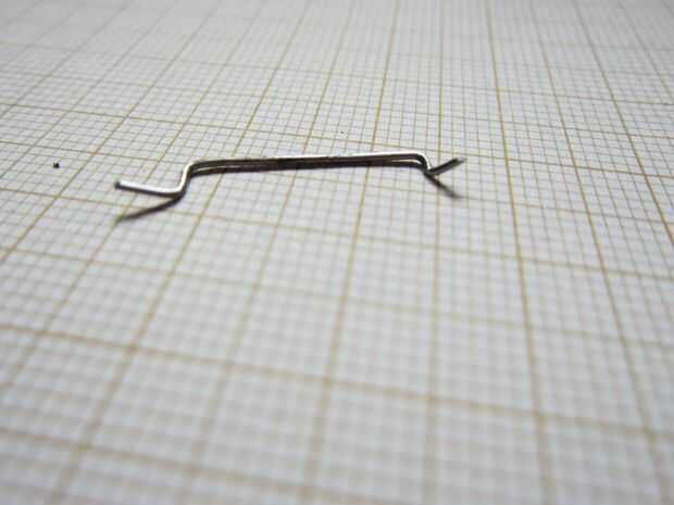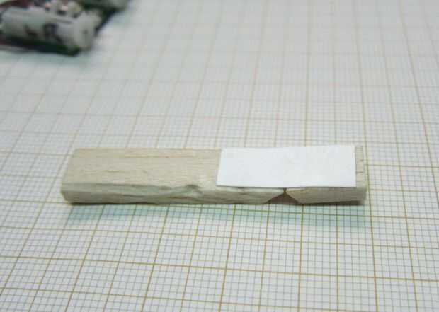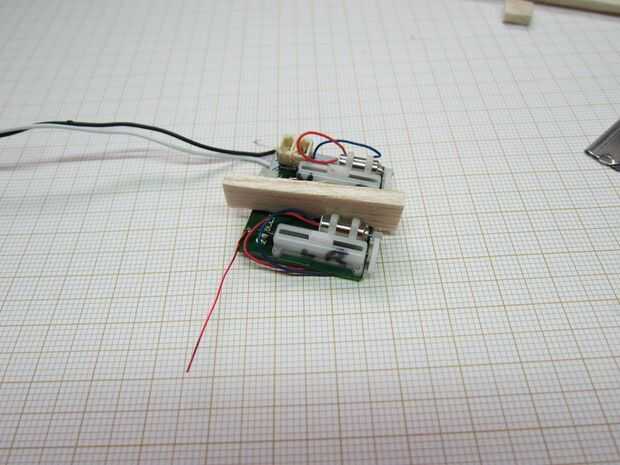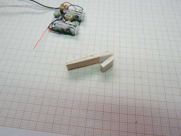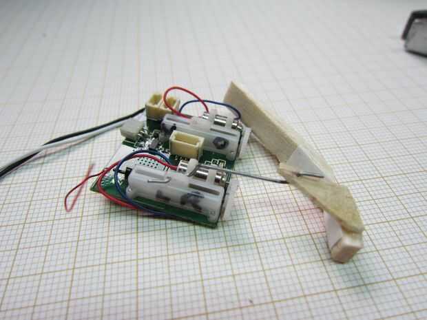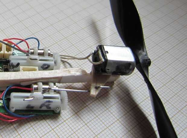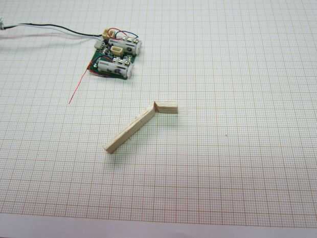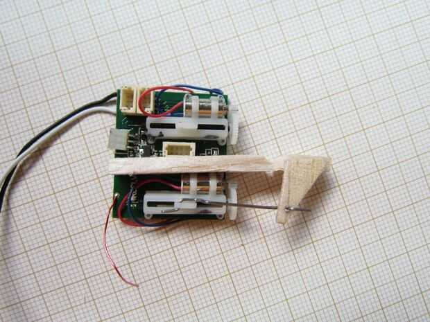 Cada cuerno del control está hecho de un triángulo de balsa espesor 1 mm, reforzado por remojo con superglue. La longitud de la palanca de la bocina debe estar cerca de la mitad el recorrido del servo.