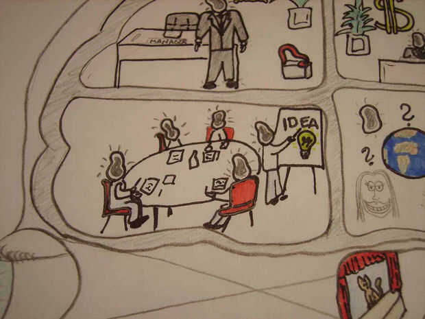 alrededor de una mesa oval son el greycells más creativos en la fábrica sentado en una silla roja acolchada.
