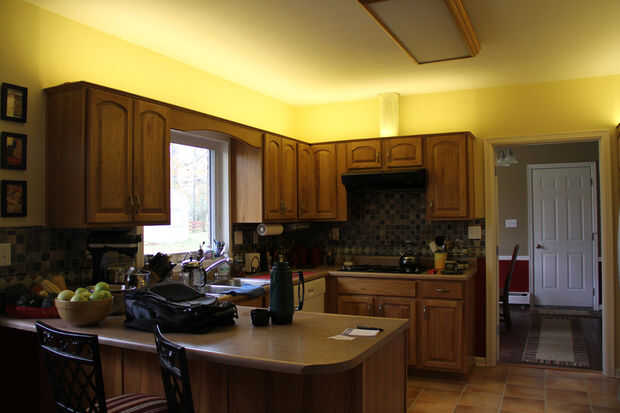 mi cocina solía tener plafones encima de los armarios (cajas drywalled que se extendía desde los gabinetes de los techos). Esto habría sido fino no fue construidos para ser abierta al ático, convirtiéndolos en radiadores inversas que aspiran todo el calor de la cocina en el invierno. Había había tenido suficiente y que se habían ido. Ahora después de la instalación sobre el aislamiento expuesto en las paredes y el techo decidí que era demasiado oscura por encima de los armarios.
