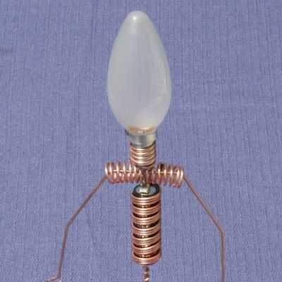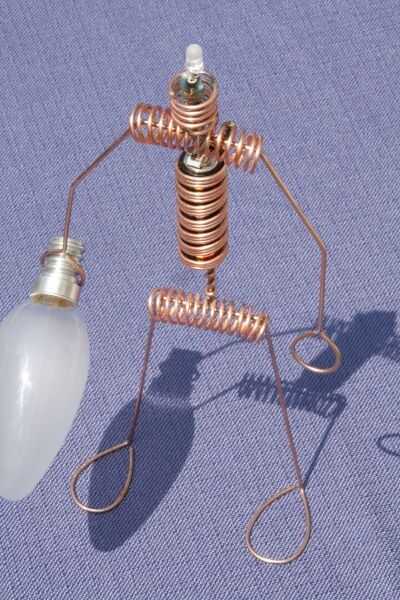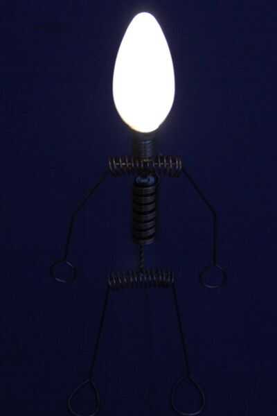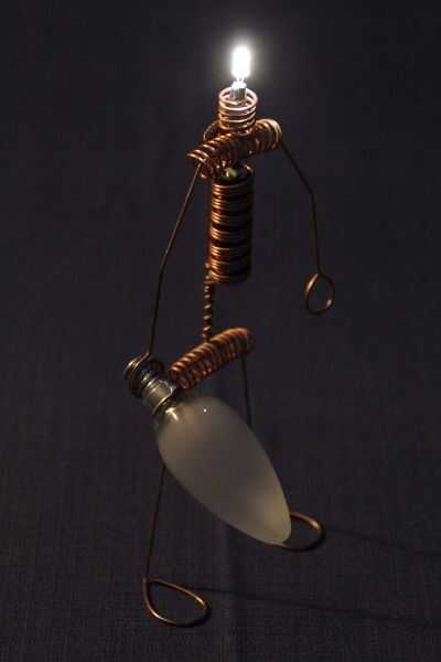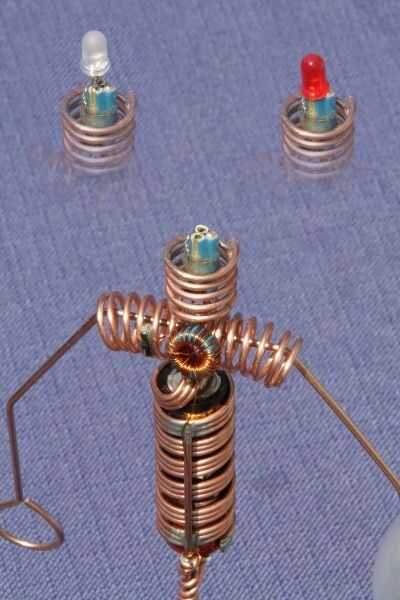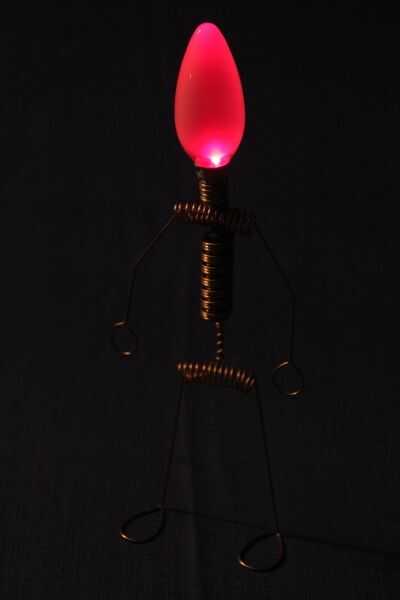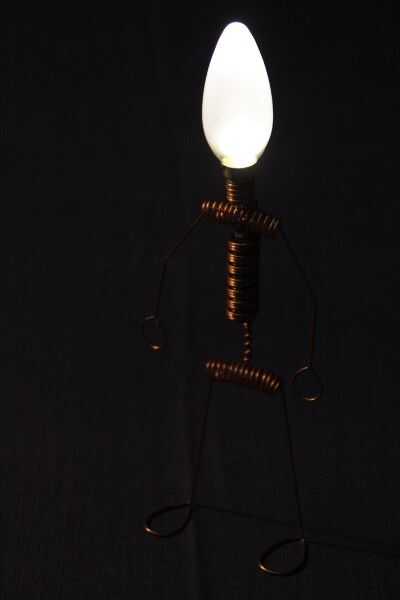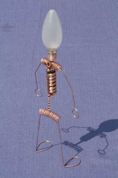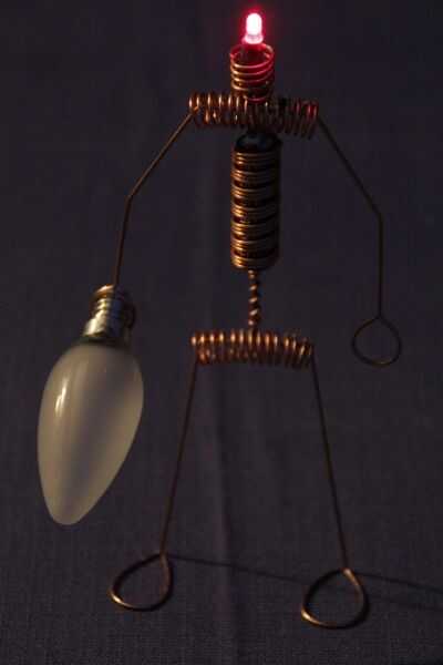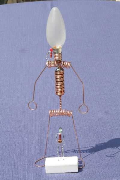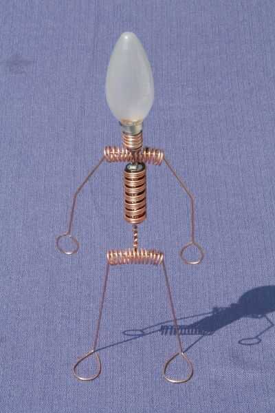 este es el gran hermano de "El hombre iluminado del LED". Otra vez usé el circuito Joule Thief para encender un LED con una sola batería AA. Pero esta vez el chico es un poco más grande. ;) Por supuesto no podía usar resistencias para el cuerpo, así que alambre de cobre de un cable eléctrico.