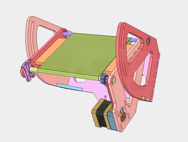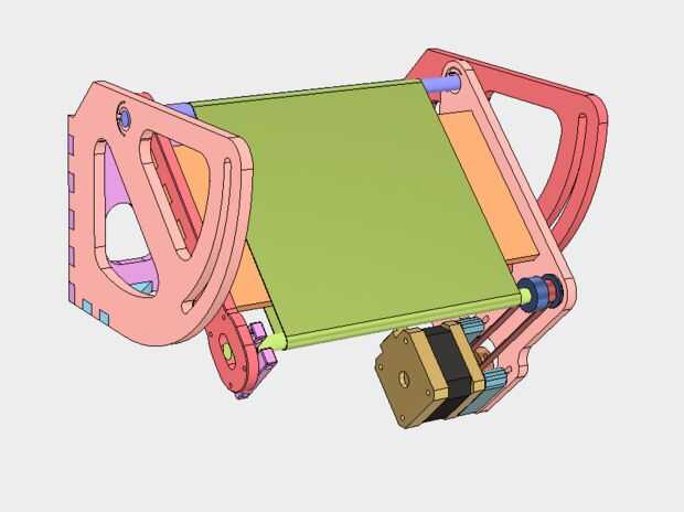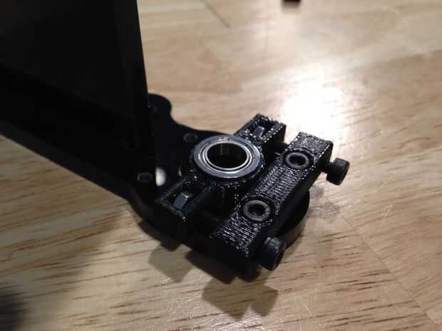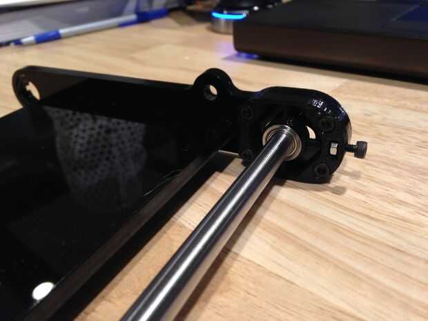 Instalación de la correa es un reto (este módulo necesita un rediseño). Con el motor fijado a la placa de montaje del motor, el tensor del cinturón apretado todo el camino, y ambos ejes de 8mm fijan en la rueda loca bar rodamientos, deslice la cinta impresa sobre los dos ejes de 8mm. Lazo de la GT2 correa sobre la polea en el eje de 8mm y asegure el extremo del eje en el cojinete en la placa de montaje del motor. Siguiente (esta es la parte difícil), ranura para la llave de la placa en las ranuras de la placa de montaje del motor y asegurar el segundo eje de 8mm en el segundo cojinete en la placa de montaje del motor. Instale a este conjunto en el marco voladizo siguiendo las imágenes arriba, ranurar los extremos del eje de rodillo de 8mm en los dos rodamientos recibidos en el marco. Utilice dos tornillos de M5 para garantizar el conjunto de cinta transportadora a los brazos de cantilever y usar los restantes tres tornillos M5 para sujetar el módulo completo al marco.