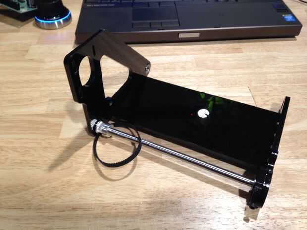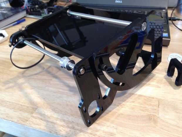 Laser-cortó el marco del módulo de acrílico de 1/4", grifo los orificios piloto del M5 y el M3 piloto. Montar, fijar y pegar el bastidor del transportador siguiendo las imágenes de arriba. Instalar dos rodamientos de brida en los agujeros en los brazos de cantilever. A continuación, montar la abrazadera y pegar placa de llave del transportador a la polea de la barra, asegurarse de que los dos cuadrados uno al otro. Una vez que haya curado el pegamento, instale al tensor del cinturón impresa siguiendo las imágenes de arriba. Instale los cojinetes de la brida en el tensor, bastidor del transportador y la placa de montaje del motor, asegurándose de que todas las bridas se hacia. La polea de sincronismo del GT2 en el eje de 8mm largo de 200mm del hilo de rosca y montaje de 5mm diámetro GT2 polea dentada en el eje de motor paso a paso, orientado para que los tornillos de fijación están más alejados de la cara de motor (véase arriba).