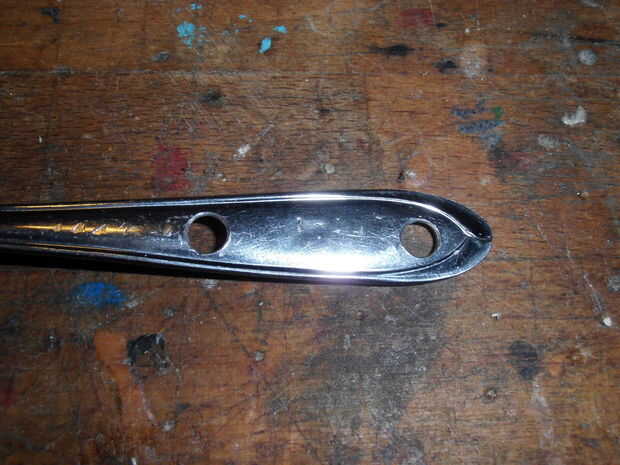 A continuación, utilizar la broca adecuada (Recuerde, usted necesita a través de un agujero para la varilla roscada) y dos agujeros en el mango de la cuchara.