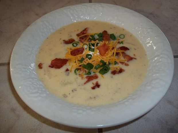 esto es una adaptación de la sopa mi madre cuando yo era un niño. Y la uno sopa que todo el mundo le gustaba. Mi marido dice que no es sopa, es una "experiencia". Papa, queso, tocino, crema agria y cebolla verde en un tazón; cálida y buena. Porque se espesa con puré de patatas instantáneo, también es libre de gluten. Es realmente rápido de preparar, en cuanto a la sopa y se puede hacer en menos de una hora.