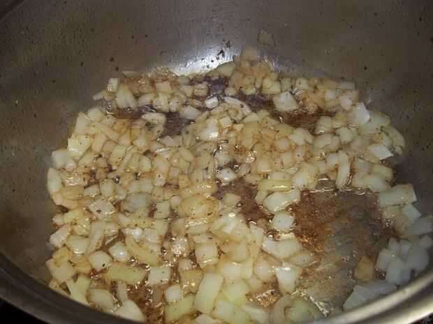 Dejar 2 cucharadas grasa de tocino en el fondo de la cacerola.  (Si usted está preocupado acerca del uso de grasa de tocino, puede utilizar aceite o puede utilizar un poco de grasa de tocino con aceite siempre y cuando el total es de aproximadamente 2 cucharadas).  Añadir la cebolla.  Rehogar las cebollas a fuego lento hasta que estén transparentes.