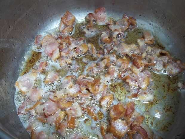 En un su pan de sopa, cocinar pedazos de tocino hasta que esté crujiente.  Retirar el tocino y escurrir sobre toallas de papel.