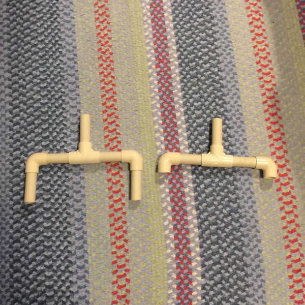 En los dos puntos en ambos las piezas "T" añadir dos tubos de 3 pulgadas para cada pieza. En las mismas piezas, solo fijarse, añadir dos trozos de ángulo recto cada pieza. Entonces, en uno, añadir otras dos piezas de 3 pulgadas en las piezas de ángulo recto.