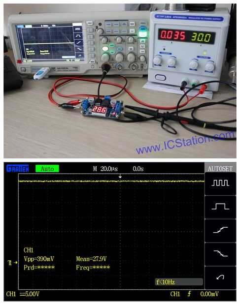 En general, el rendimiento de Paso LM2596 hacia abajo módulo de potencia es muy buena. Mejor te hubieras fijado el voltaje de salida 3 ~ 4V más bajo que el voltaje de entrada, entonces los resultados de la prueba será más estables.