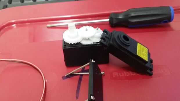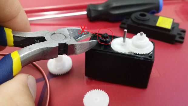 Utilice un par de cuchillas para cortar de la punta plástica del servo, como se muestra arriba.