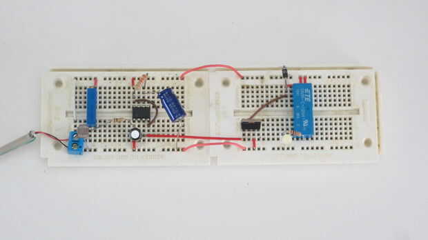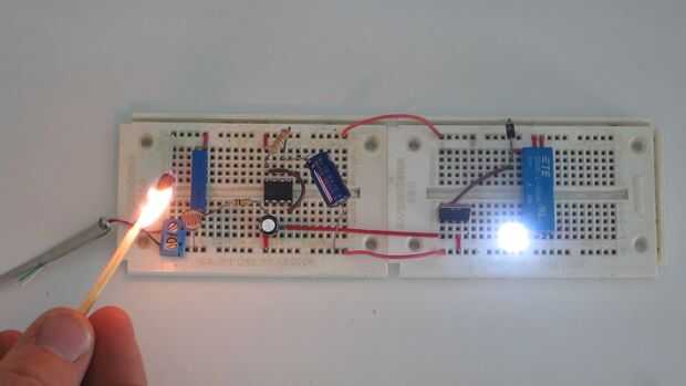 Él es siempre una buena idea al prototipo el circuito en un protoboard antes de soldar juntos. Aquí un simple LED se puede utilizar para indicar cuando la salida está activada. Probablemente usted necesitará ajustar la sensibilidad del sensor para que coincida con la iluminación de la habitación. Para ello, ajuste de la resistencia variable.