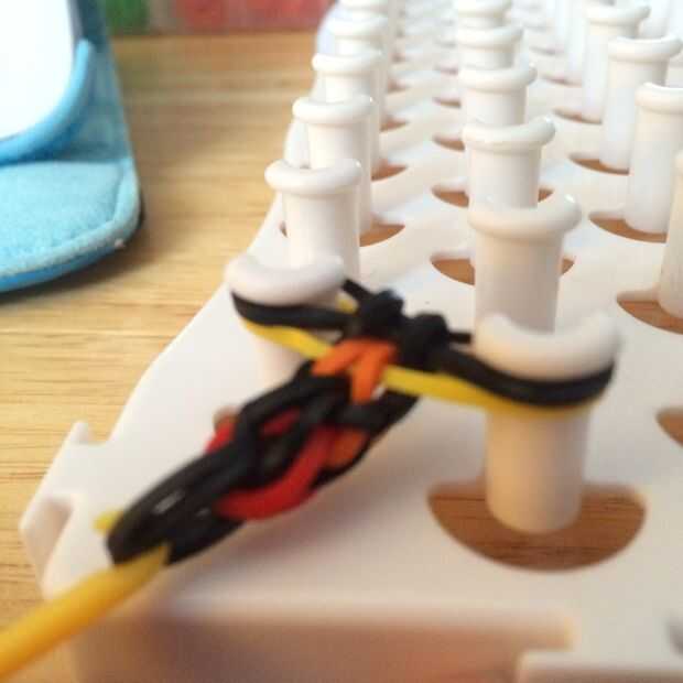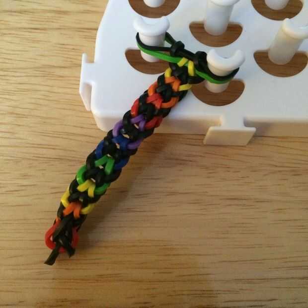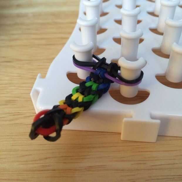 Continuar hacer el último paso hasta que la pulsera es suficiente. Una vez más, tire de la banda media lo suficientemente lejos para alcanzar a través de él y la banda inferior del gancho agarrador. Lazo venda por encima de las otras bandas.