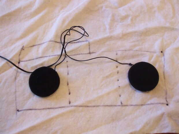 Entonces saqué mi idea sobre la broca de fieltro. La foto es de ninguna manera perfecto, así que siéntete libre cambiarlo todo. Básicamente se divide en 4 compartimentos; 1 para cada altavoz, 1 para el manojo de cables extra y otro para que el cable pase a través