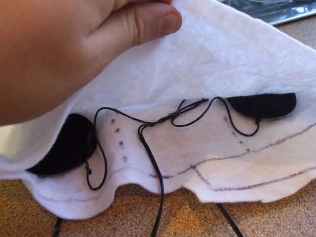 Pegamento ambos altavoces a aproximadamente la mitad de cada una de sus secciones. Luego el cable sobrante (tenía un poco) del paquete y pegar juntos y a la mitad de su sección. También puede pegar el cable que pasa a través de la línea de cosido para facilitar la costura más adelante.