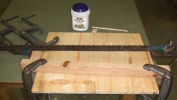 Al mismo tiempo, hice tacos de madera de 1" largo para que llegar 1/2" de los tacos en ambos lados. Siguiente fue la parte difícil, la guarnición. Para la guarnición, usé Fevicol Sr., un calambre de hoja y las abrazaderas en C para mantener la madera en su lugar.