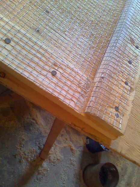 Rodillo hacia fuera el alambre, virar con 1 1/2" clavos en cada esquina y cortar. Ahora, empiezo con la parte posterior, que no es necesario superponer las partes, porque los extremos del cable serán cubiertos por los 2 lados. Entonces lugar clavos cada 6" a un pie aparte hasta que el cable es todo, en cada lado.