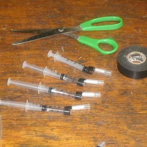 He usado secciones de cinta aislante por la mitad longitudinalmente para grabar los canales de aire a los órganos de la jeringa.