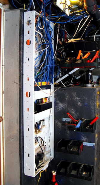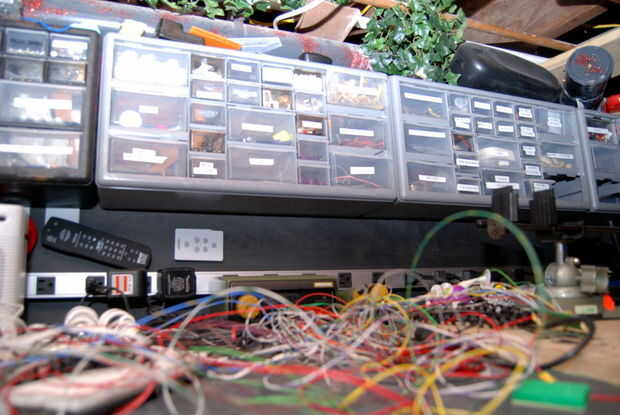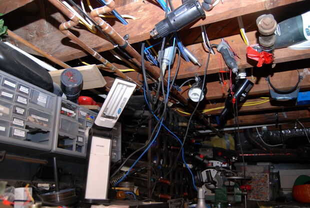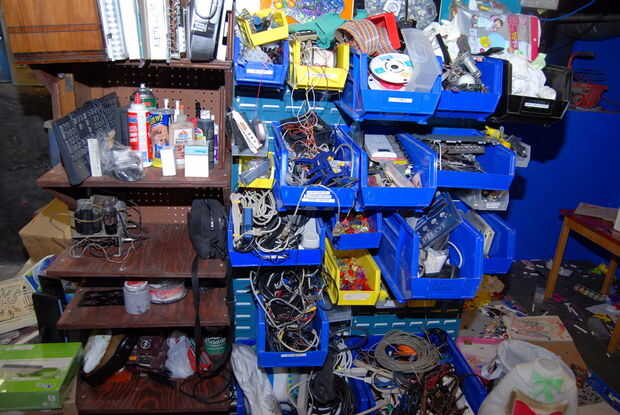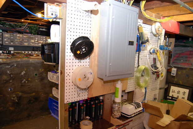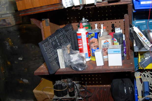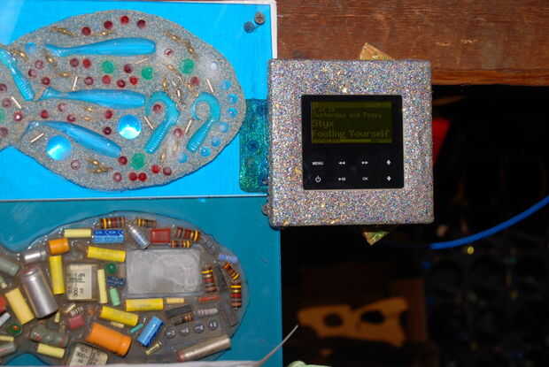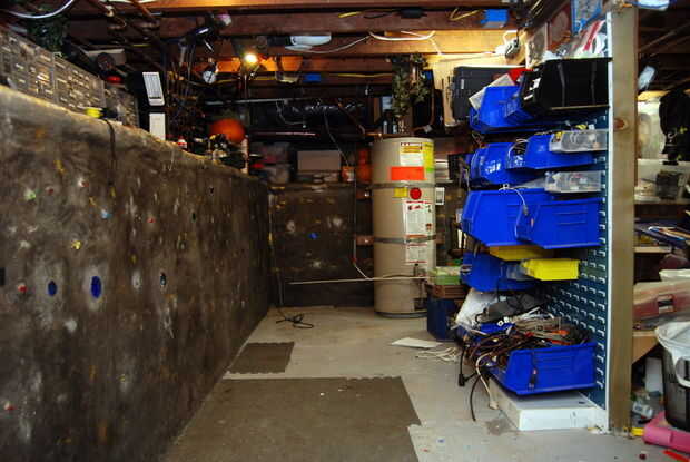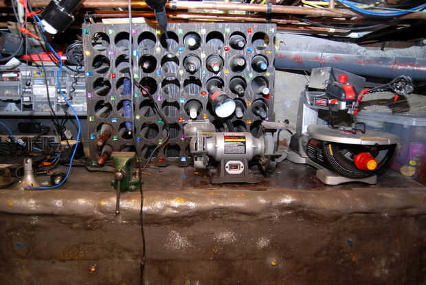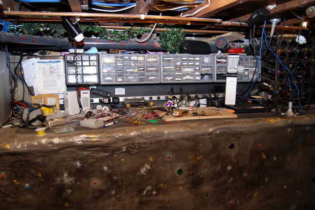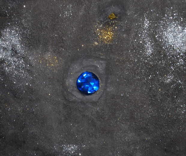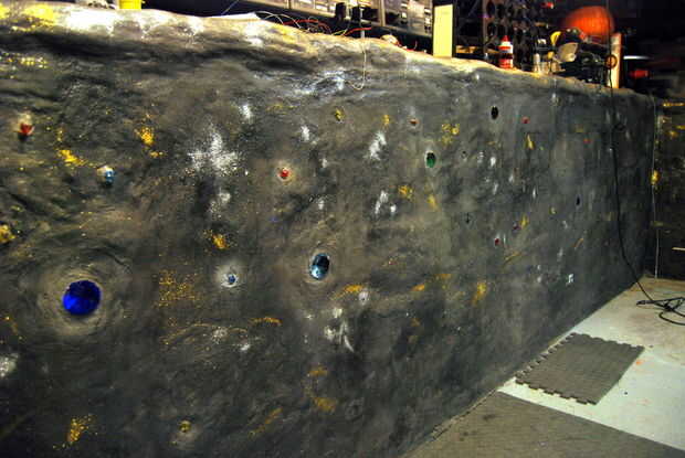 Las gemas de vidrio vinieron de eBay. He utilizado un martillo perforador para crear agujeros y luego había cementado en. Para simular vetas de oro y plata, he espolvoreado en brillo fino y luego sellados con sellador de concreto de alto brillo. Las gemas son rociadas con pintura en aerosol invisible luz negra que hace un efecto fresco con los accesorios ligeros fluorescentes 4 escondidos en las vigas del techo.