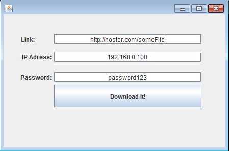 Simplemente ejecutar el archivo jar para su uso. Escriba la dirección IP de la placa de Galileo, escriba la contraseña para el servidor que ejecuta en el tablero ("abc" por defecto) e inserte el enlace del archivo que deseas descargar en los campos designados como se muestra en la fotografía.