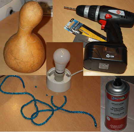 Corta una calabaza vacía con la parte inferior, una lámpara y montaje, pintura de aerosol, una máquina de perforación con diversos tamaños de brocas, granos en los tamaños que se adapta a los agujeros de taladro.