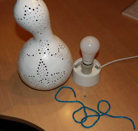 Añadir cuentas de si es posible desde el interior, en la parte superior no podía llegar y llegar desde el exterior. Tuve algunos de los agujeros un poco más grandes para las cuentas de ajuste, tener mucho cuidado, que la calabaza es frágil es más porosa de los orificios de perforación.
