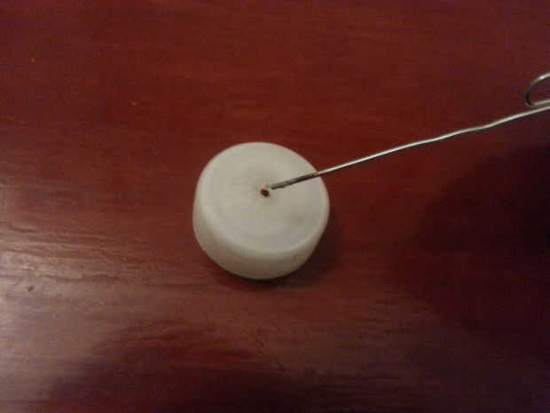 Ahora usted tendrá que hacer un pequeño agujero en la tapa de la botella. Deben ser capaces de girar libremente sobre el eje de su mini-motor (sin equipo), pero no fuga de agua hacia fuera. para ello, doblar el clip directamente. A continuación, caliente sobre una llama abierta y hacer un pequeño agujero en el centro exacto de la PAC. a continuación utilice un lápiz o una varilla de ahusamiento para ensanchar el agujero hasta que es suficiente hacer girar libremente sobre el eje del motor. Esto evitará fugas de su lámpara, si se hace bien es. No te preocupes, hay otras maneras para sellar la lámpara demasiado. En el siguiente paso.