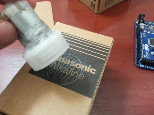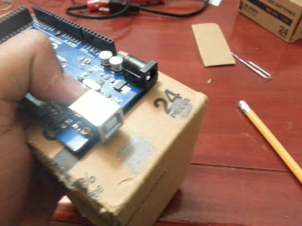 Use la cuchilla x acto, hicieron los agujeros y había verificado que el arduino puede caber bien en la parte inferior de la base de la lámpara. Como veis en la foto tres, arduino sobresale un poco. Esto nos permitirá cargar código para el arduino y luego simplemente conéctela de entonces encendido para encender la lámpara.