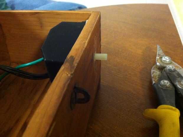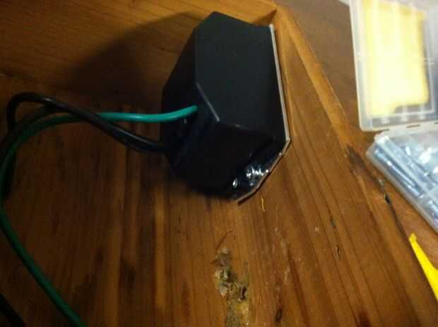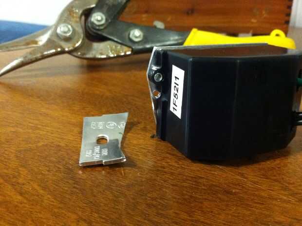 Ahora instale el interruptor del atenuador. Dependiendo del tamaño de su caja y su ubicación del interruptor, deberá modificar el regulador un poco la vivienda. Eso es lo que tenía que hacer. ¿(y es lo que hacemos aquí de todos modos, a la derecha)? En mi caso tuve que quitar el metal de la parte superior e inferior con tijeras de tijeras para chapa.