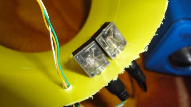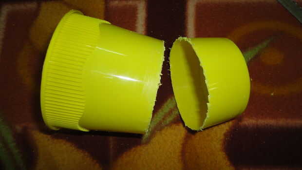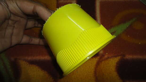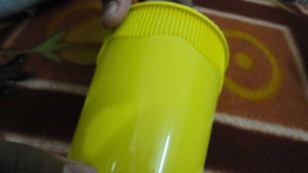 Ahora vamos a empezar por hacer la de esta lámpara. En primer lugar el envase y retire está cubierta de plástico. Ahora corte 1,5 pulgadas de la parte inferior. Ahora toma la parte superior y mantener a un lado la parte inferior, no lo necesitas. Cinco perforaciones de casi mismo tamaño 5 mm de diámetro, tres para el separador, uno para el cable auxiliar y otro para el puerto del adaptador de energía. Ahora fijar el separador como se muestra en las imágenes y también fijar Puerto hembra del adaptador en su respectivo agujero. Ahora mantenga este montaje a un lado.