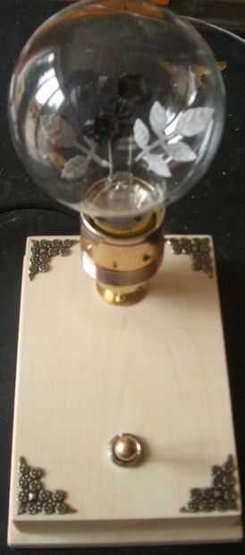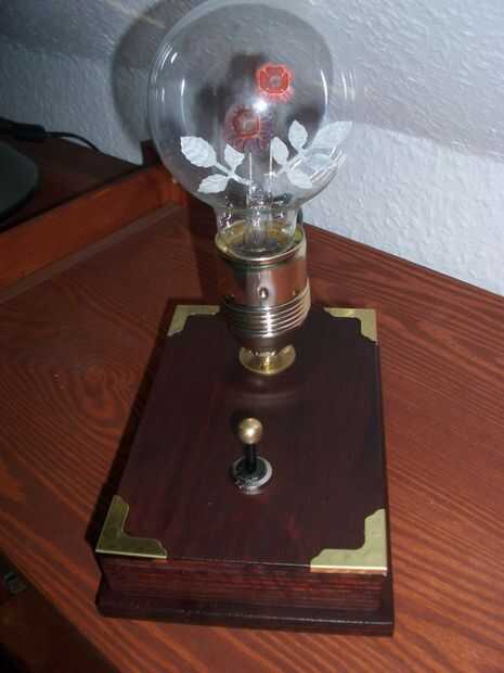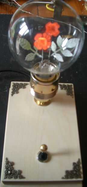 En una tienda especial para bombillas de luz encontré una hermoso resplandor la lámpara. Dentro es una flor y si proporcionas red se enciende en color rojo con hojas de color verde. Esta bombilla necesitaba un soporte con un conector para la toma de corriente y un interruptor. Y montante de sí vapor Punk era una necesidad. :-)