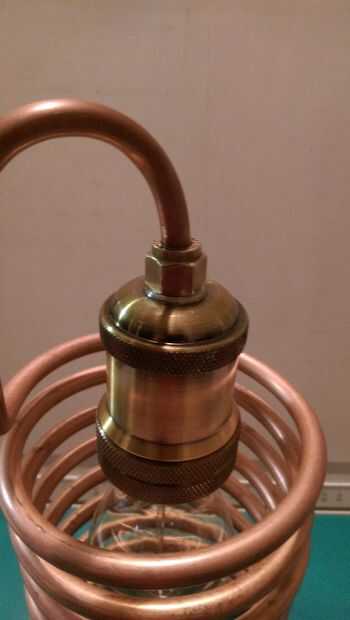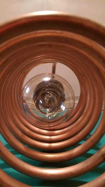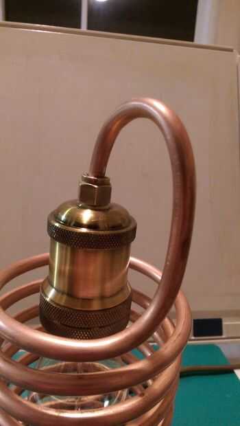 Deja una cola al iniciar la primera bobina que se necesitarán más adelante. Para obtener la espiral incluso dejo las bobinas Haz empujado hacia arriba de la anterior por la siguiente bobina en espiral hasta que tuve alrededor de 8 bobinas formadas. La parte más difícil es conseguir el retorno en la parte superior de la bobina que sostiene el portalámparas E27 para la lámpara de Edison. Hice una antigua circular más pequeño para esto obtener una curva agradable. Tómese su tiempo con esto como quieras una curva de 90 grados hacia arriba primero seguida de una curva de 180 grados en el centro de la bobina sin colapsar la tubería. Obtener la sal de la tubería golpeándolo y enjuague con agua ya que es corrosivo con el cobre. Permita que el tubo secar completamente o soplar con aire comprimido para quitar las gotitas de agua que quedan. Ajustar el espaciado de las bobinas de tu agrado y alinear todo hasta antes de la próxima etapa.