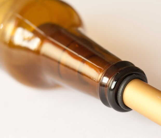 Para mantener las botellas que decidí ir de una manera muy sencilla e ingenua. Sólo se cortan tres gomas de un tubo de bicicleta fina. Ponga una banda en la extremidad superior del vástago (tal vez usted desea extraer los cables y tomas de corriente por el momento), luego voltee el borde externo de la banda, que asumirá la forma de la imagen. Ahora puede insertar madre, hilo y encaje en el cuello de la botella, luego empuja la goma y tirando el cable que puede bloquear la botella en posición.