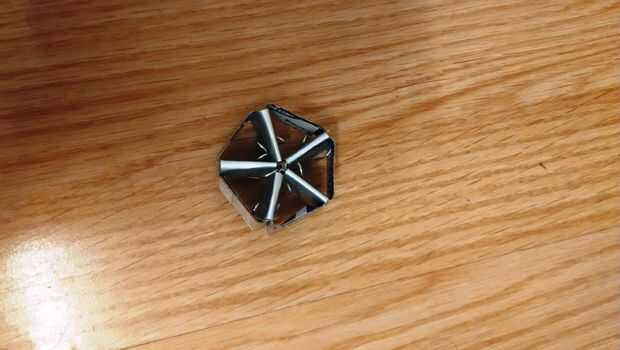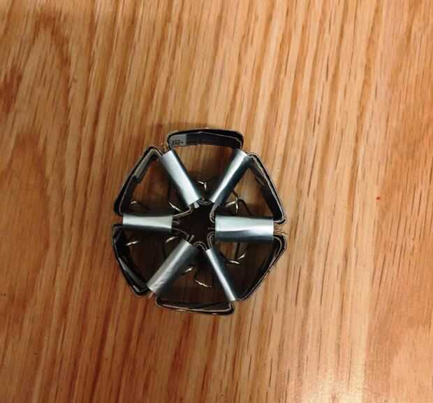 Descargar el archivo PDF e imprimir una copia con papel de tamaño carta o Legal. Con talla Legal puede esperar una esfera de radio 15 de cm. Añadir 5 hojas de papel por debajo del patrón de color/blanco y cortarlas (uso algunas cintas para mantener l