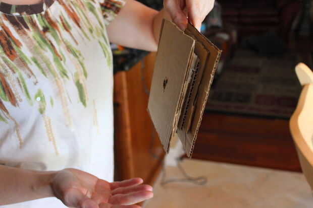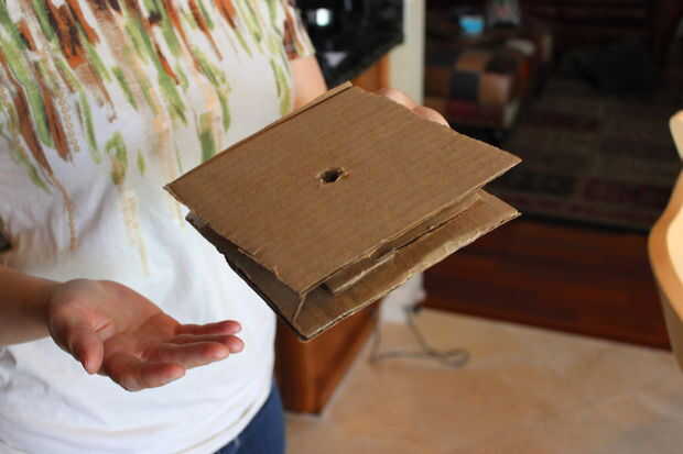 Deja comienzo con la base. Trazar un cuadrado de buen tamaño de su caja de cartón. Hice unos 6 "x 6". Corte hacia fuera, luego cortar un montón de piezas más pequeñas que son también cuadrados. Se pila de éstos para arriba, uno encima del otro, para dar el volumen base. Luego simplemente haga un orificio en el centro con un lápiz puntiagudo. Sé lo que estás pensando, va a ser difícil, pero no es! El lápiz afilado será ir a la derecha a través de todas las piezas como la mantequilla. Hacer el agujero más grande simplemente usando tijeras cerradas y meneo alrededor allí. El agujero debe ser lo suficientemente grande como para caber los cables a través del tiempo.