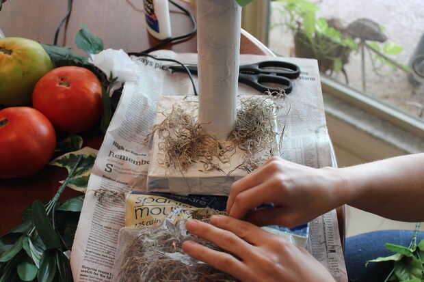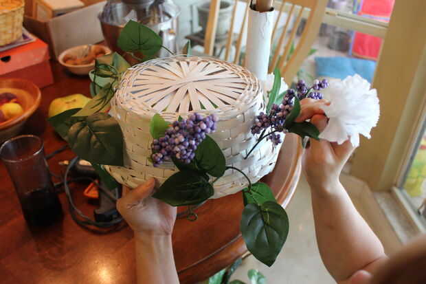 Aquí viene más divertido! Tiempo para poner su creatividad a buen uso. Decorar la lámpara con las varias plantas que se ha reunido. Puede tejer fácilmente las plantas y enredaderas de la cesta; otra buena razón para usar uno! ;) Esta parte es especialmente depende de usted cómo desea que su linterna para ver. Para mí, quiero una lámpara de aspecto elegante y casi elegante. He añadido unas flores y diferentes hojas y tallos para ayudar a unir todo. También he añadido algunos musgo español en la base para dar más de un aspecto terroso. Esta lámpara es que debe ser eficaz como una lámpara y aún brillantes con exuberantes plantas cuando apagan las luces.