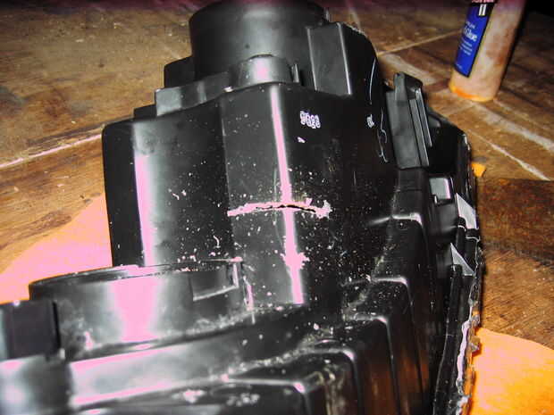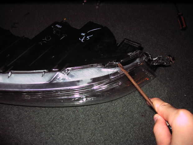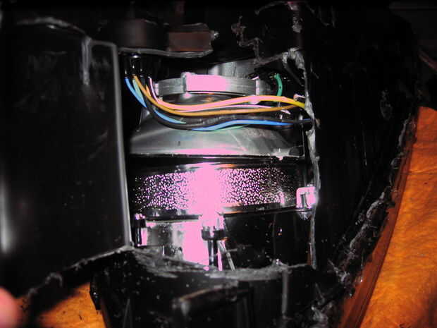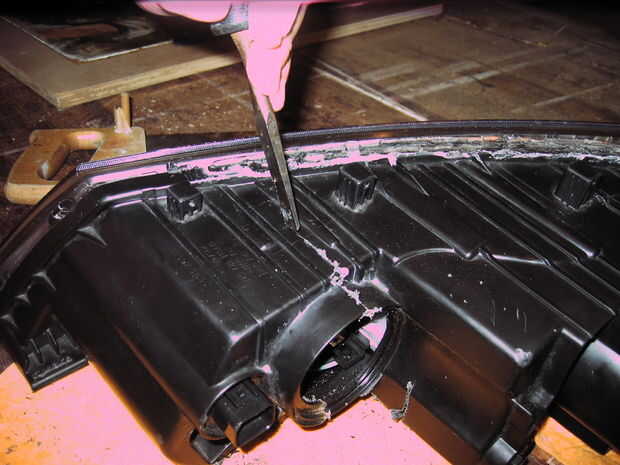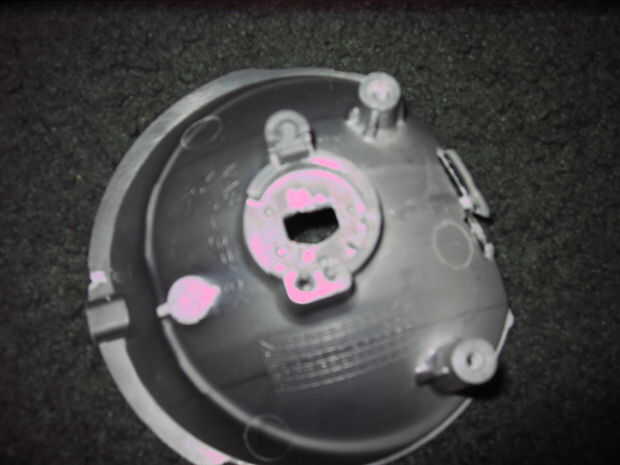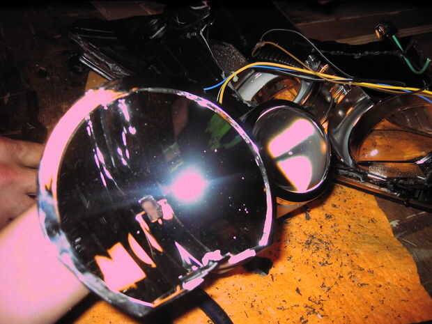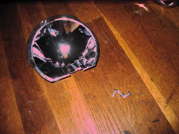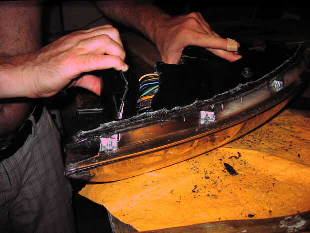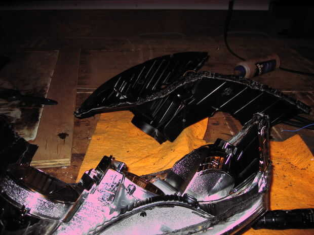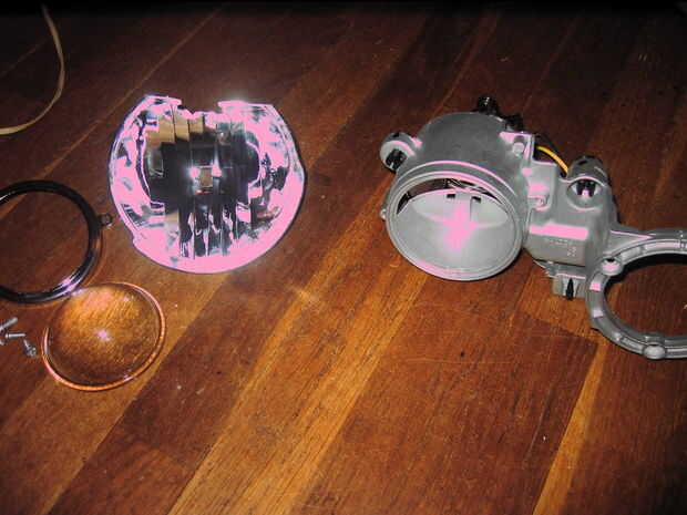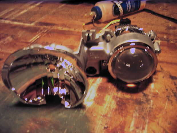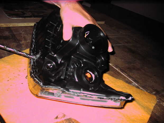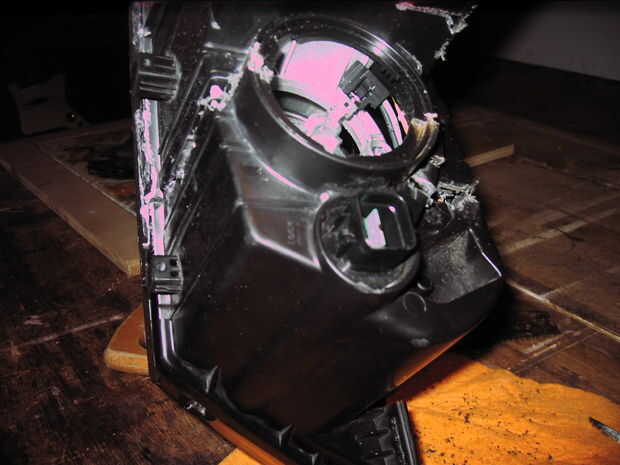 Ok el primer y más difícil paso es quitar el plástico negro de la luz reveladora de los reflectores y el cristal. después de incontables horas de cortar, taladrar, serrar o cincelar finalmente pude quitar la parte de atrás. una vez hecho esto quitar la pieza de metal que contiene el reflector principal: (fotos en el orden de destrucción)