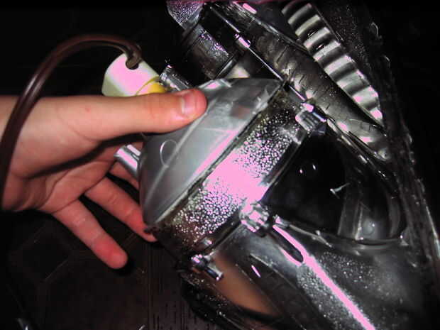 a continuación sostenga el recién formada "lámpara" que hicimos con la luz del coche. Manténgalo pulsado durante un minuto o así, si el plástico se calienta en la parte frontal del faro han utilizado una bombilla con una potencia demasiado alto. Mantenga test bombillas diferentes hasta que usted puede encontrar uno que no se calienta tanto. Utilice pegamento caliente para fijar la luz en la parte posterior del reflector de la noche. luego pegar el reflector en el faro. También pegamento cristal bola lo nuevo donde lo que solía ser. Finalmente envolver los alambres sin aislamiento en cinta aislante.