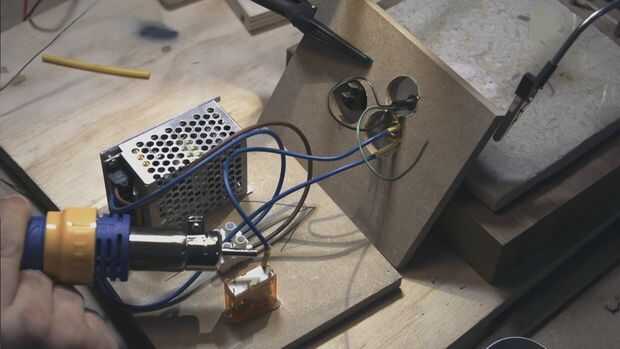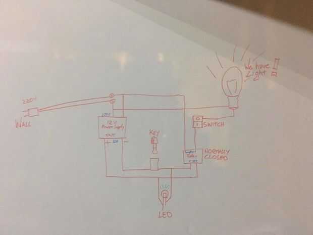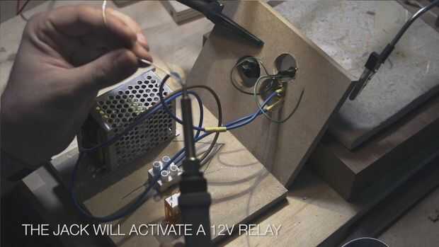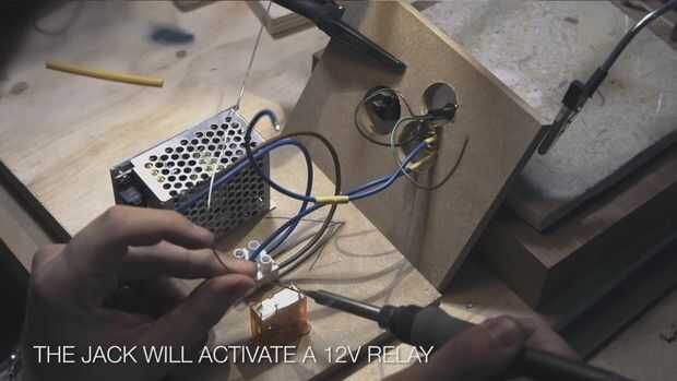 El circuito consiste básicamente de una fuente de alimentación de 12V y un relé que se activa cuando se inserta el conector de 1/4". Esto también activa el LED verde y el interruptor de eje de balancín.