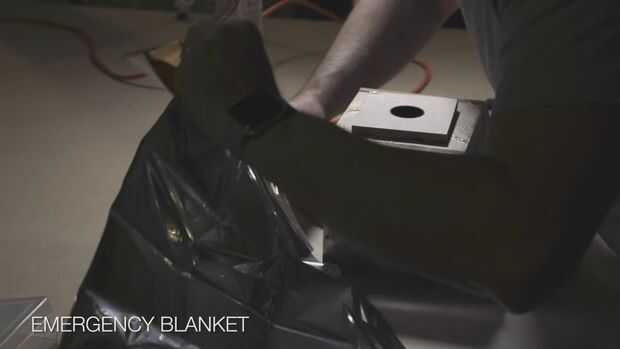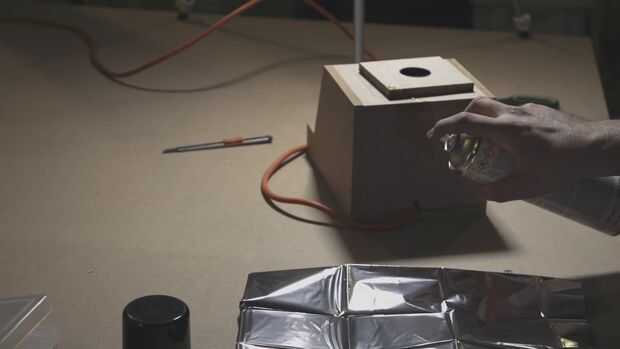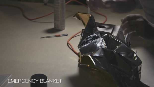 Spray pegamento hace relativamente fácil pegar un mylar (manta de espacio) alrededor de la base de la lámpara. No se preocupe si es un poco arrugada ya que ese es exactamente el aspecto es después.