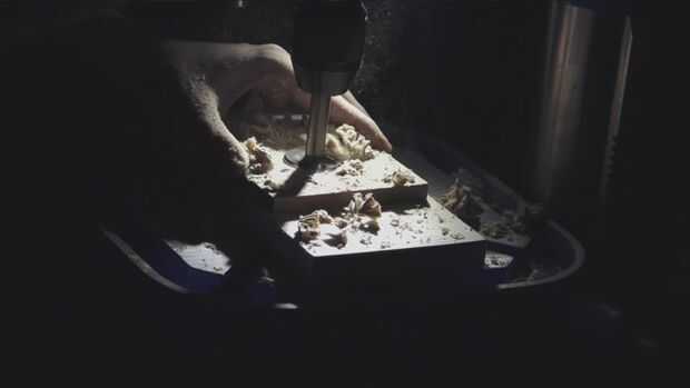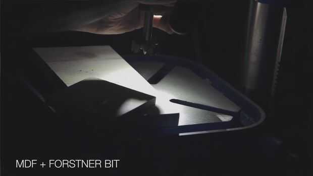 Un pedacito de forstner entonces fue utilizado para perforar un agujero lo suficientemente grande como para la conexión de la lámpara a través del centro del tablero MDF.