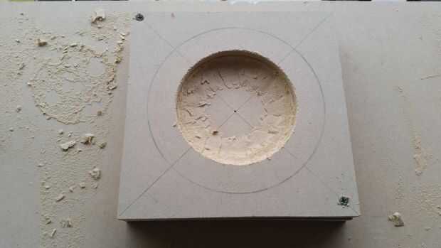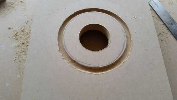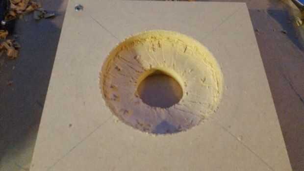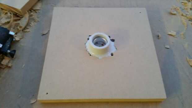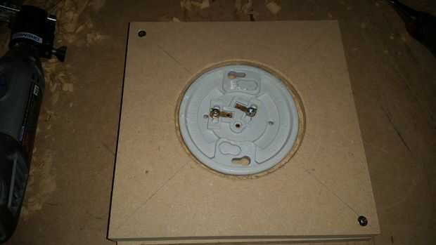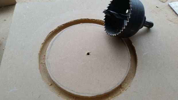 Utilizando 2" Sierras, corte un agujero en la segunda pieza de MDF. Asegúrese de que su base de la lámpara se ajusta y no sobresale en absoluto. Cuando se coloca vertical, solo el MDF debe tocar la tabla.