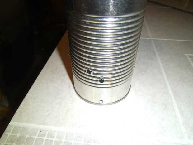 En este punto, vas a tomar la lata grande y hacer 12 puntos en él con un marcador que le muestre dónde perforar. La puerta se marcará en sus rincones: los puntos de la parte inferior será adecuados en la parte inferior de la lata pared, 2 1/2 pulgadas, con las esquinas superiores marcados 1 1/2 pulgadas por encima de eso.