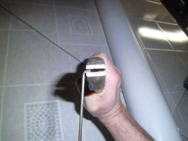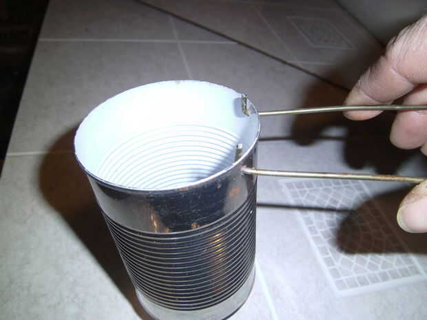 La lata que se va cocinando con va a calentarse mucho mientras esté en uso, por lo que tendrá un mango para manejarlo bien. Taladre dos orificios 1 1/2" aparte y de una media pulgada desde la parte superior de la lata. Corte un pedazo de la percha 12 pulgadas de largo y colocar una curva perezosa en en el punto medio para formar una manija. Doble 1/2" de ambos extremos con un ángulo de 90 grados con los alicates de la juez de línea.