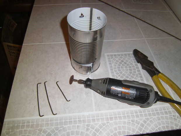 Usando la herramienta rotatoria, cortar dos varillas de soporte para la cocción pueden para adaptarse a las dimensiones de la lata grande (de la can que he utilizado, he hecho mía 3 3/4" de largo). Doblar un giro de 90 grados en los extremos de ambos, como se muestra en la foto. Continuación, utilice la herramienta giratoria para cortar su puerta, recordando que sólo cortar la parte superior, inferior y un lado (se necesita el otro lado conectado para que funcione como una bisagra).