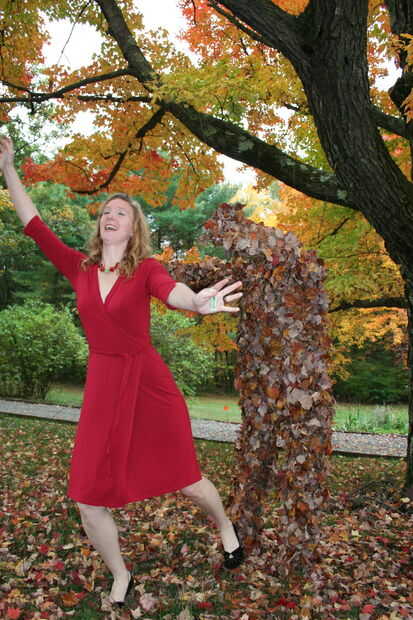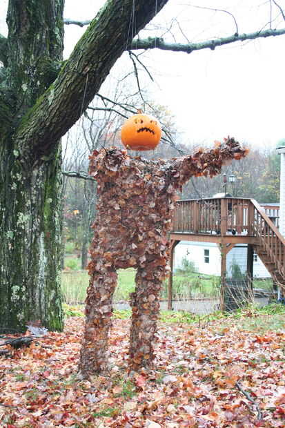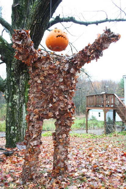 Esta creación tuvo unos 3 noches para crear el cuerpo y media hora para hacer la cabeza. Necesitarás algún alambre de pollo, una cuchilla de trabajo pesado, guantes de cuero, adhesivo en aerosol y una amplia oferta de hojas. Para la cabeza que necesitarás dos solar powered lámparas de jardín, algunas lineas de pesca para colgar y por supuesto - una calabaza!